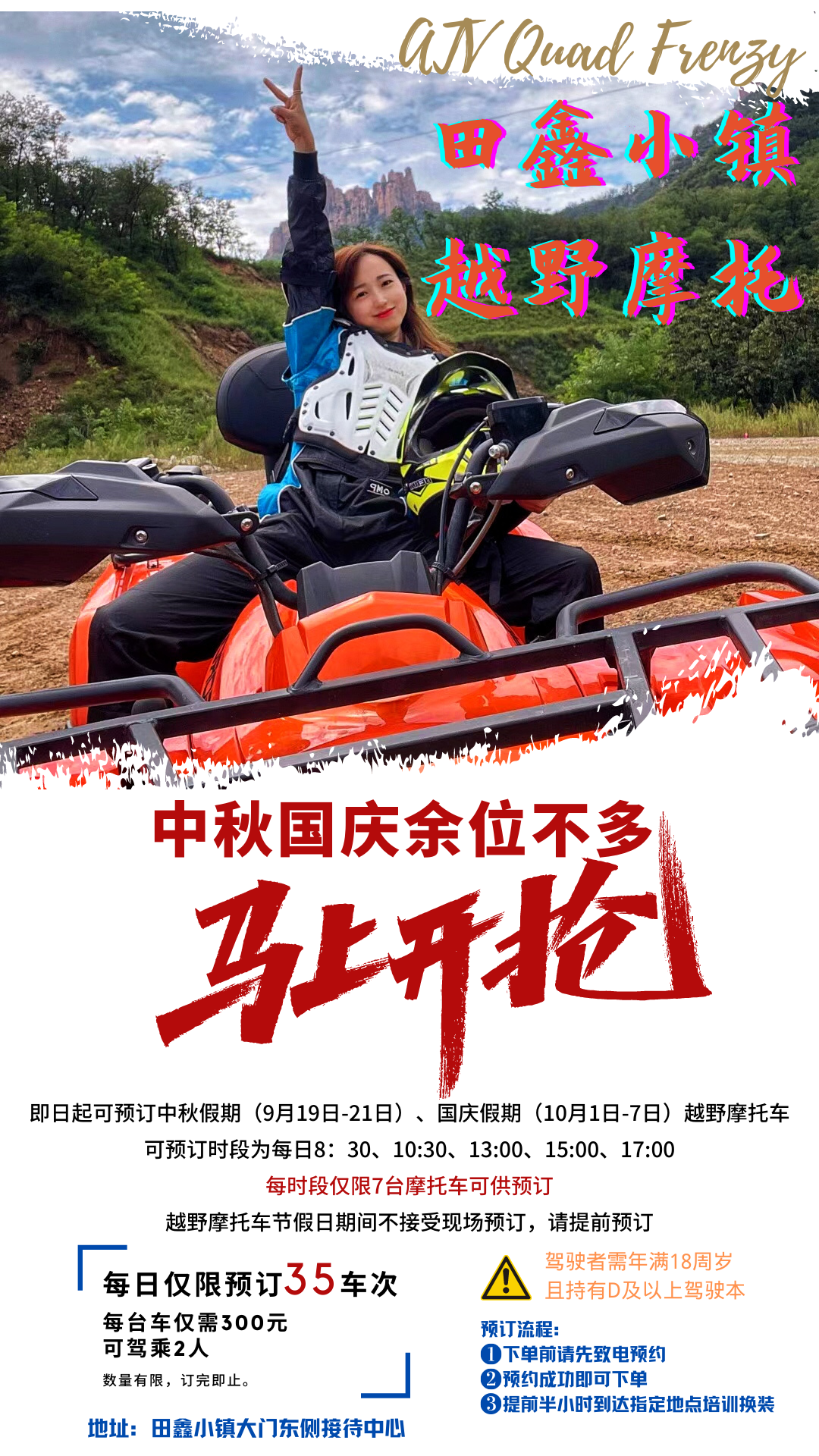 今年最火爆、最好玩的娱乐项目 当属位于田鑫小镇的越野摩托车了 #专业的ATV越野摩托车# 山地四轮越野车ATV(All Terrain Vehicle),是一项极限挑战的娱乐项目,中文翻译为“适合所有地形的交通工具”,足以满足驾驶者对赛车运动的渴望。这个项目虽然是极限运动,但ATV越野车宽大的轮胎与地面接触产生了较大的摩擦力,因此不易空转打滑,行驶也十分安全,驾驶者可尽情体验! 我们使用的车辆均为春风450L型ATV越野摩托车 排量:400cc 最大功率:22.5kW 最大扭矩:33N.m 发动机类型:单缸/四冲程/水冷/SOHC/四气门 传动方式采用轴式传动,很好地解决了传统链条式传动方式易脱落、断裂出现安全事故的问题。 #专业越野赛道# 越野赛道路线全长约15公里,全程用时约1小时。 途径河滩水路、陡坡、泥坑、丛林等多种地形,全部为自行开发的纯越野线路。 河滩水路全长1.5公里,越野摩托宽大的轮胎在河滩水路中能提供强大的抓地力,让你无惧险滩,一往直前! 爬山陡坡路段总长3公里,共有40°以上陡坡三个,越野摩托400cc排量强劲的发动机给你提供澎湃的动力输出,让你轻松攀过陡坡,征服原始山林! 泥坑、丛林路段总长5公里,一起穿越原始丛林,途径泥坑、砂石、急弯等多种地形,带你探索大自然未知之地! 沿途空气清新,风光秀美,身处大自然野外丛林之中,让你在体验越野摩托惊险刺激之余还能感受到山间丛林之美。 怎么样,看小姐姐们飒不飒! 快带上你的小伙伴们来田鑫小镇越野摩托感受越野的刺激吧! #中秋国庆越野摩托火热预订中# 中秋国庆节假日期间,游客较多,请提前预订 温馨提示: 驾驶越野摩托需持有D及以上驾驶证。 此项活动具有一定危险性,游玩一定选择正规机构保障自身安全。 地址:武安市活水乡田鑫小镇接待中心 营业时间:8:00-18:00 预订电话:0310-5995999